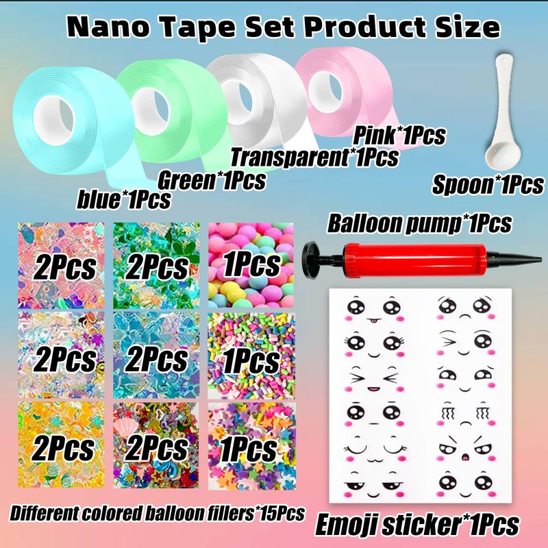 - Product includes: Nano Bubble Tape Kit including 4 rolls of nano tape ,, 1 spoon, 14 packs of different shapes and colours of glitter and 1 box of small macaron beads, 1 sheet of cute emoji stickers and 1 balloon inflator.