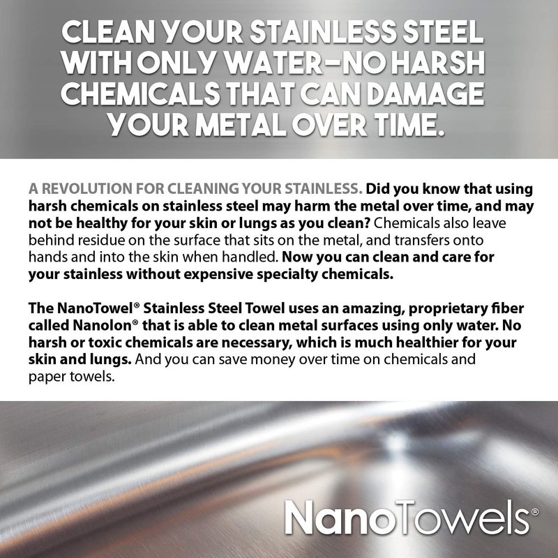 THE NANO TOWELS® STAINLESS STEEL CLEANER REMOVES STREAKS, SMUDGES, AND FINGERPRINTS FROM ALL STAINLESS STEEL AND METAL SURFACES USING JUST WATER. Lift dirt, fingerprints, grease & grime like a magnet! The Nano Towels® Stainless can clean almost ANY metal, but WON'T SCRATCH! Amazing for kitchens, bathrooms, garages, or anyplace that you have metal to clean and shine.