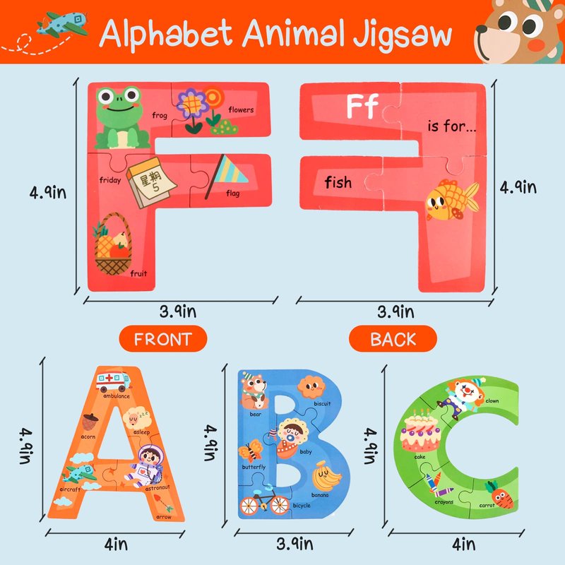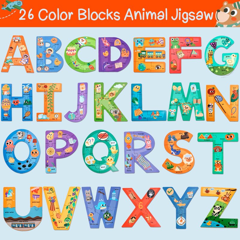 - Toddler Puzzles Ages 3-5:Each letter is composed of 3-4 puzzle pieces, each puzzle piece has a word starting with the corresponding letter and the corresponding cartoon picture, which helps the kids to better memorize the writing of letters and recognize words. The oversize puzzles design reduces the difficulty, the number of puzzle pieces is small, making it easier for toddlers to grasp and splicing, and can also help kids establish a sense of achievement and mental growth.