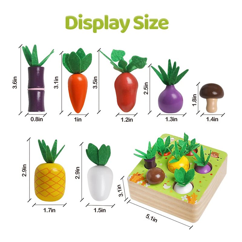 - Engaging Farm Harvest Game:This Montessori-inspired toys set features a delightful farm harvest game with various vegetable and fruit shapes.It’s designed to captivate toddlers' attention while helping them learn about different fruits and vegetables. The game is engaging and encourages toddlers to explore and interact with their environment.