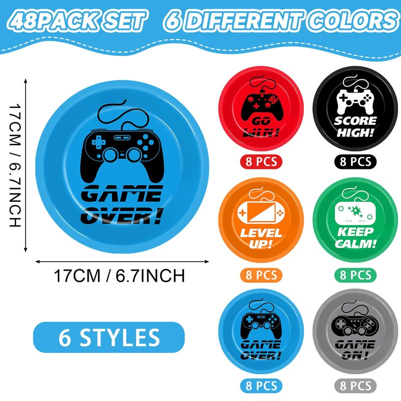- Package includes: Our video game party plates set includes 72 pieces of 7-inch plates, featuring 6 unique designs with 12 plates of each type. Ideal for gaming birthday party decoration and gamer-themed birthday party supplies, these plates will delight guests of all ages.