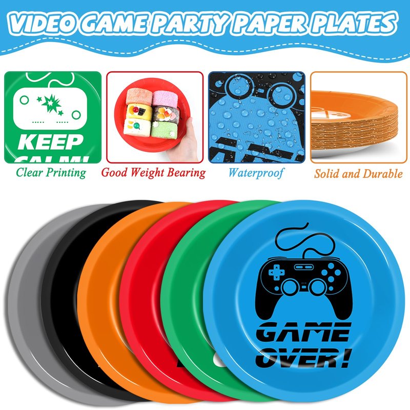 - Premium quality and printing: Our gaming theme paper plates decorations are crafted from thick paper, guaranteeing their durability and sturdiness without bending or leaking. This premium material can hold more food. Moreover, the video game dinner plates are printed with high-quality water-based ink, ensuring a pleasant dining experience for your valued guests.