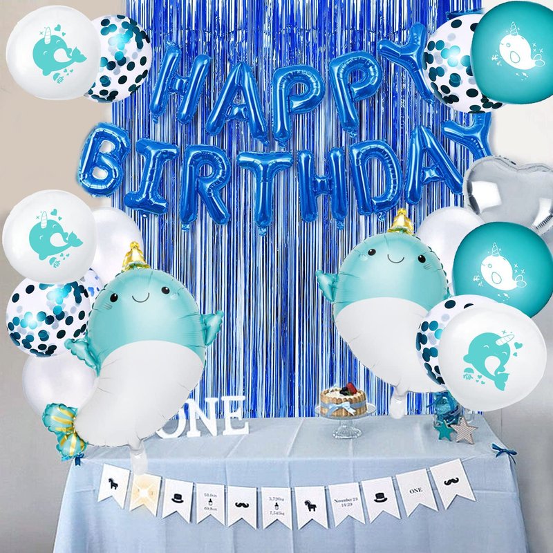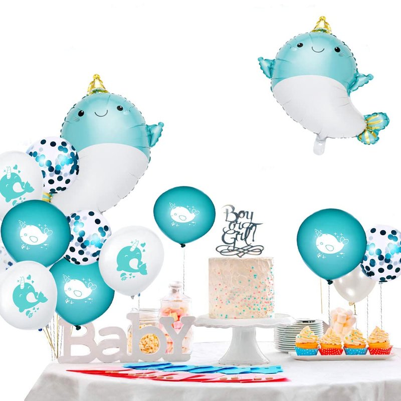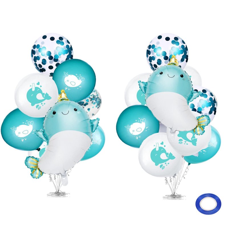 - 🐳Super Cute Narwhal Balloons: The package total in 18pieces, 2 pcs foil narwhal balloons and 5pcs blue confetti balloons, 5pcs white narwhal pattern balloons, 5pcs blue latex balloons and 1pcs blue ribbon.
