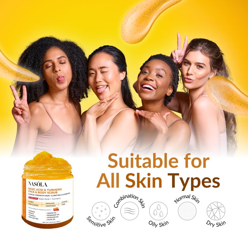 - PERFECT FOR ALL SKIN TYPES: Tailored for every skin type, Nasola Kojic Acid & Turmeric Face & Body Scrub infuses the goodness of Kojic Acid, Turmeric, Licorice, and Papaya. Enriched further with Shea Butter, Vitamin E, Lemon Oil, Rosemary Oil, Avocado Oil, and Olive Oil, our scrub assures hydration without clogging pores, making it perfect scrub for sensitive, dry, oily, combination, and normal skin.