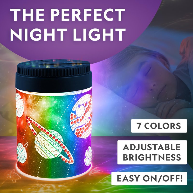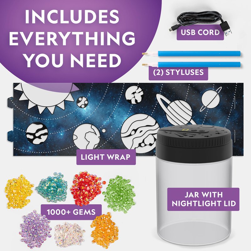- EVERYTHING INCLUDED - Kids get everything they need to create a spectacular outer space night light: color-changing lid and light jar, 1,000+ gems in 7 colors, 2 styluses for applying gems, solar system light wrap, and micro-USB power cord.