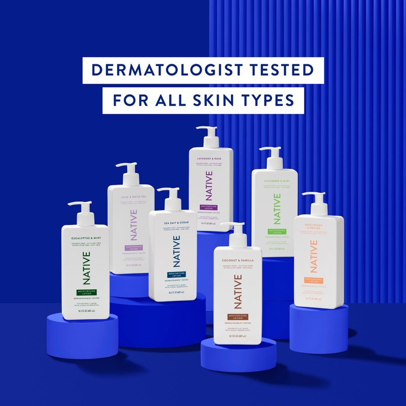 Dull, thirsty skin is a thing of the past thanks to our moisturizing lotion. Made with plant-based moisturizers that restore dry skin, and made without silicones, dyes, or petrolatum, this rich, creamy formula absorbs quickly and leaves skin feeling soft and smooth. Native lotion provides all day moisture and is dermatologist tested for all skin types.
