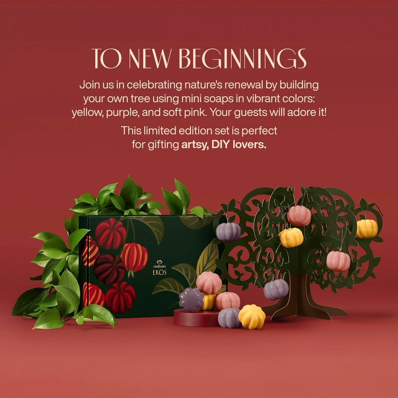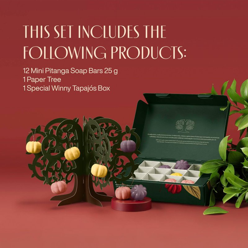 - Each season, nature renews itself. Life sprouts, grows and produces new fruit that will rinse the next harvests. This tree is an invitation to celebrate renewal and new beginnings to come. This limited edition set is a build your own tree with 12 mini pitanga soaps in three different colors: yellow, purple and light pink. The artwork for this set is a collab with Winny Tapajos, a Amazonian artist.