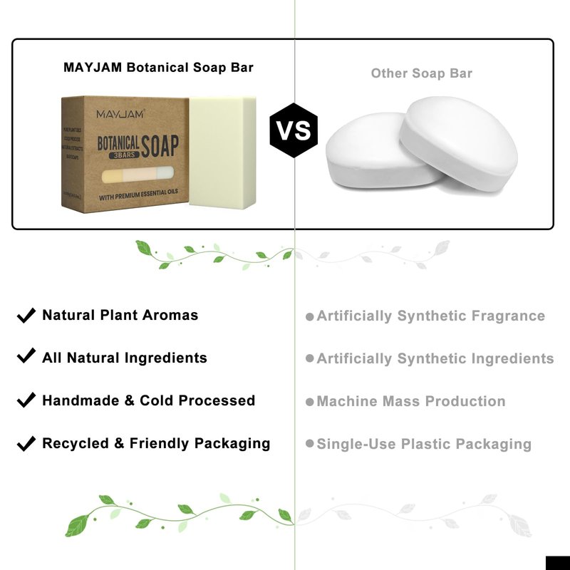 - Cold Process: MAYJAM bar soap has passed FDA certification.Made by hand using 100% plant based and all natural ingredientsand chemical-free, toxic-free.Great for the environment No wasteful body wash plastic to get rid of Leaves body squeaky clean
