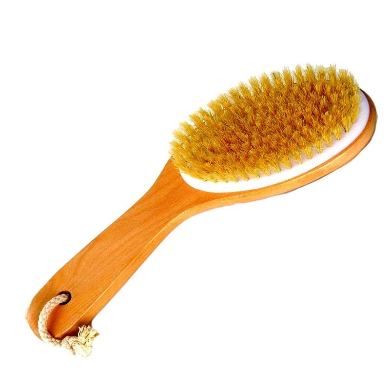 Natural Boar Bristle Body Brush with Wooden Handle by Spa Destinations for wet or dry brushing bath and shower