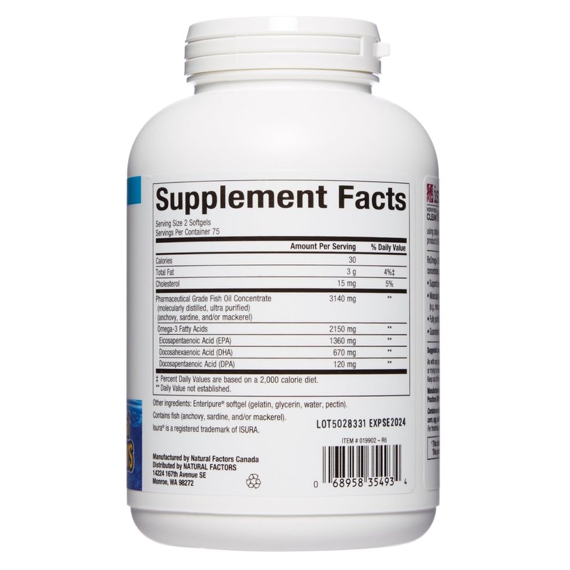 Natural Factors, Ultra Strength RxOmega-3 Fish Oil, High Potency Formula, 2,150 mg Omega-3 Per Serving, No Fishy Aftertaste, 150 Softgels
