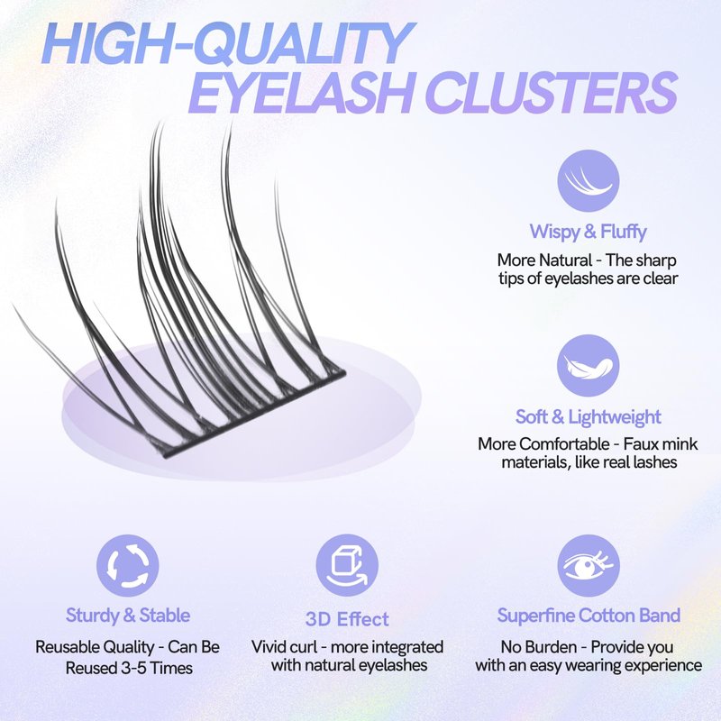 - 【Beginner Friendly Cluster Eyelash】The latest wider band design can achieve a beautiful eye with 3-4 clusters, which is more efficient than the traditional 30D eyelashes that require 10 clusters and simplifies the makeup process. The natural C/D curl effortlessly embellishes the shape of your eyes. Natural eyelash clusters make your lashes look fuller. The length of wispy eyelash extension is 10.5-13.5 mm, and the large capacity of 105 clusters can satisfy at least one month's eyelash needs.