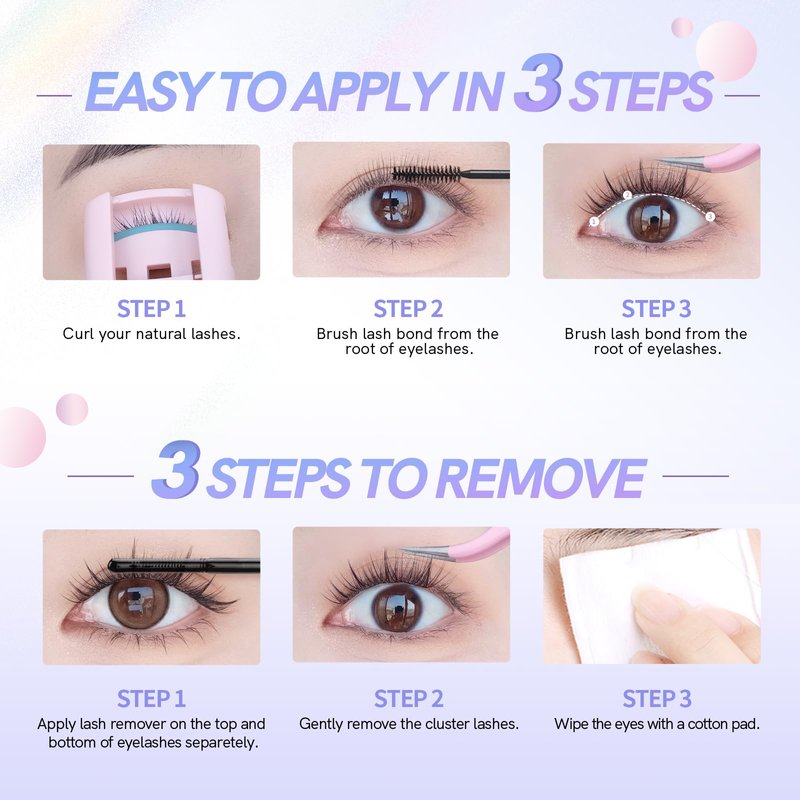 - 【4 Steps to Apply & Comfortable Wear】Our lash glue is quick-drying, long-lasting, quick to apply in just 4 steps and beginner friendly. As long as you apply the glue evenly to each natural eyelash, it can easily last for 24 hours! Whether you wear cluster lashes for short periods of time or for long periods of time throughout the day, your eyes will remain comfortable and unburdened.