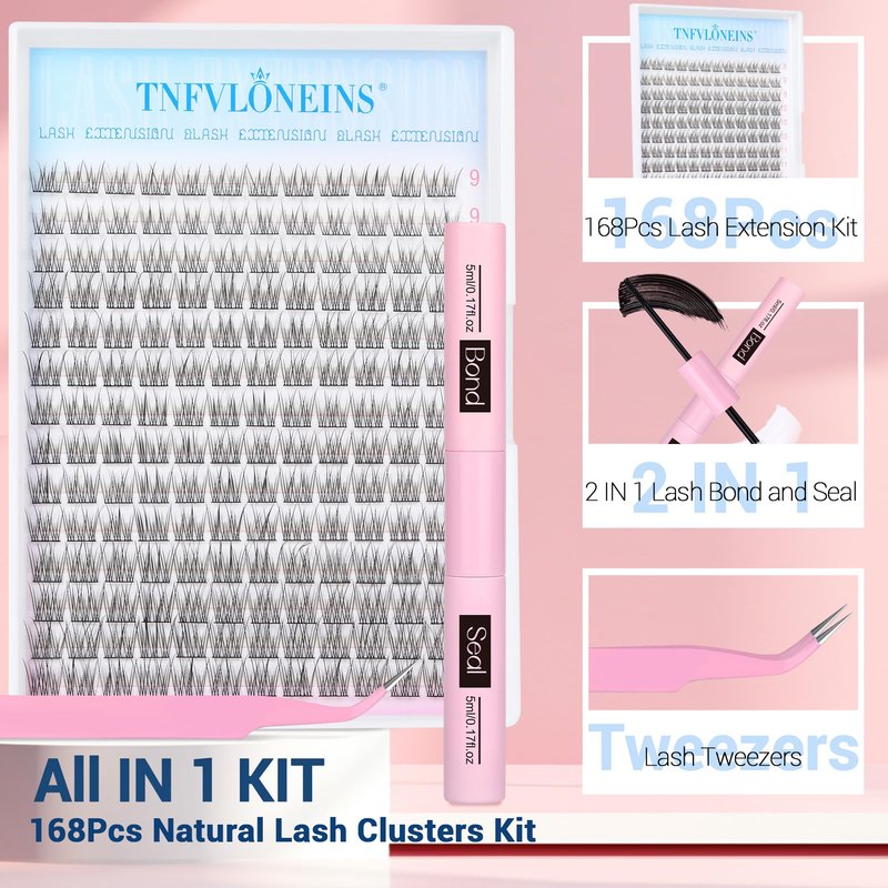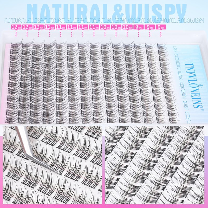 Natural Lash Extension Kit 168Pcs Lash Clusters Kit Wispy Eyelash Extensions 9-12MM Individual Lashes Extensions with Bond and Seal Lash Glue and Eyelash Extension Tweezers DIY at Home by TNFVLONEINS