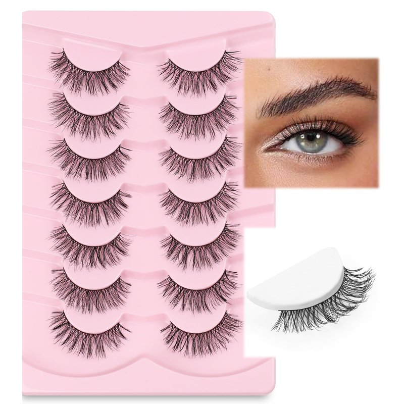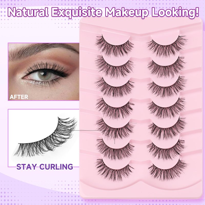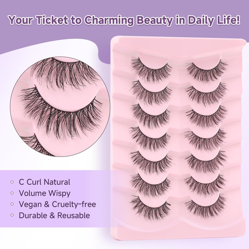 - VEGAN & REUSABLE: 7 pairs eye lashes pack. The fake eyelashes use ultra-light faux mink fibers, cruelty-free, skin friendly. Bring pretty natural lash extensions look without damaging your own eyelashes, suit for DAY-TO-DAY use, wedding, vacation and so on
