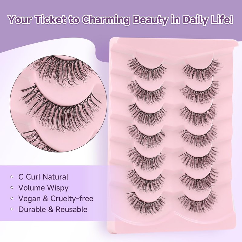 - VEGAN & REUSABLE: 7 pairs eye lashes pack. The fake eyelashes use ultra-light faux mink fibers, cruelty-free, skin friendly. Bring pretty natural lash extensions look without damaging your own eyelashes, suit for DAY-TO-DAY use, wedding, vacation and so on