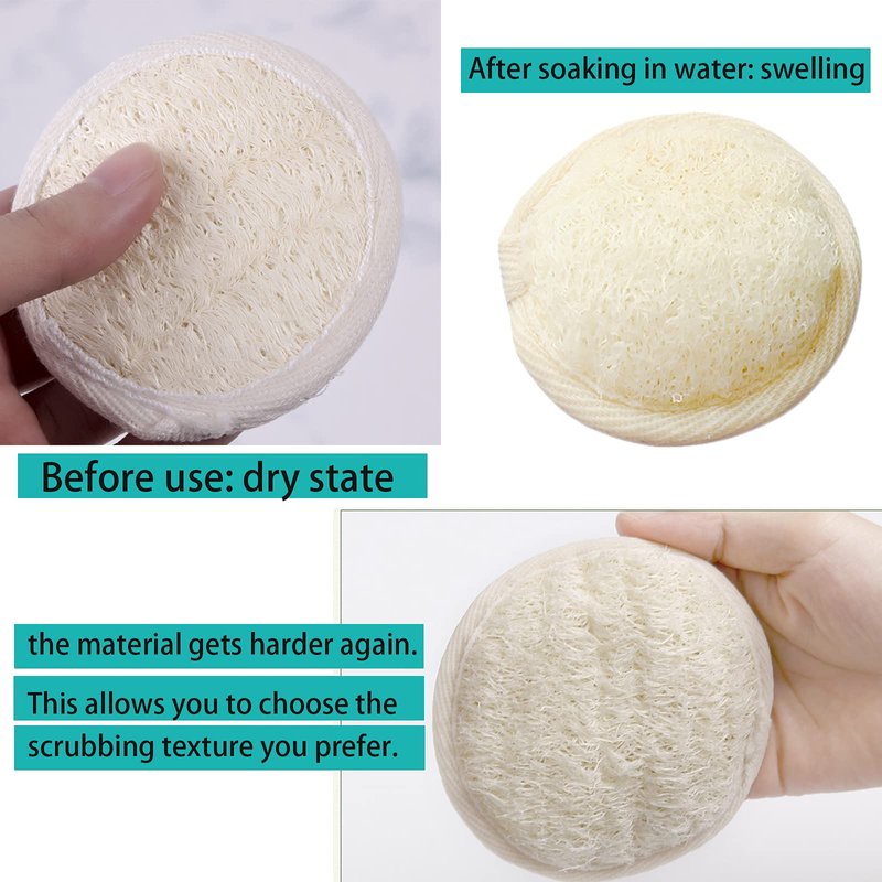 - Before use, soak the loofah sponge pad in warm water to soften the loofah fiber and make the sponge swell. The more the water is, the softer the loofah sponge pad will be. You can adjust the texture to wipe the skin according to your needs.