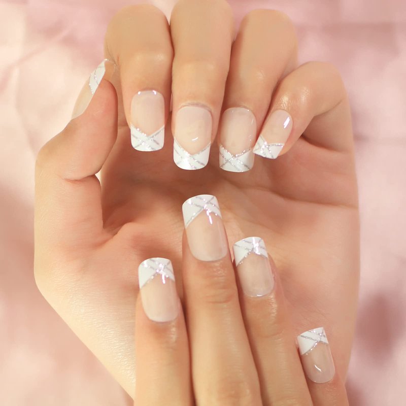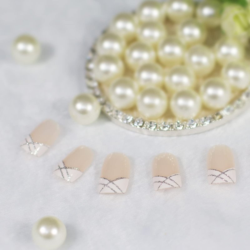 Natural Nude Pink White French Nails Press on False Nails Silver Glitter Line Squoval Fake Nails Medium Short Full Cover faux ongles for Home Office Finger Wear Nail Art Tips