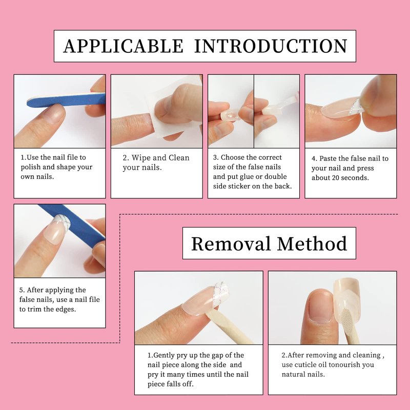 - 1. About the nails- Squoval Shape False Natural Nude Pink White French Press on Nails ,Manicure DIY Faux Ongles. Also it is Medium Short length, make you more charming.