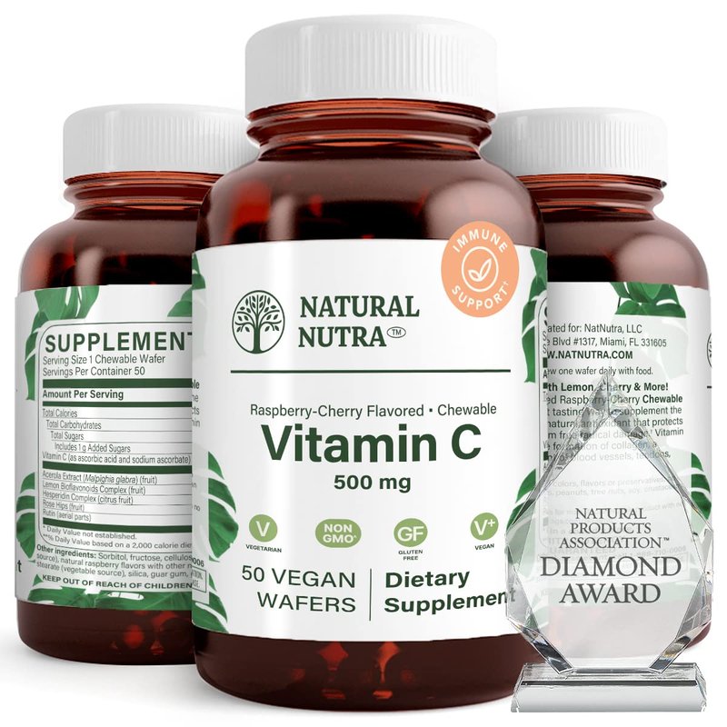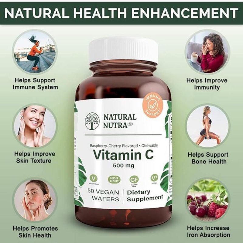 Natural Nutra Vitamin C Supplement for Kids and Adults, Immune Booster, Protect Skin and Heart Health, Vegetable Source, 500 mg, 50 Vegan Wafers