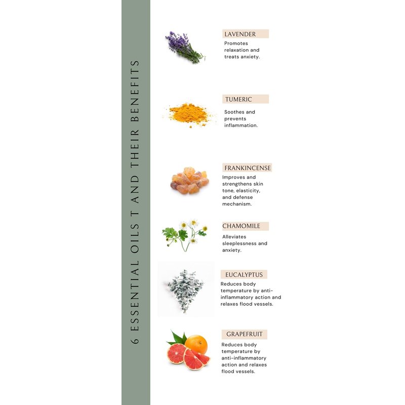 - ESSENTIAL OILS: Each bath bomb contains a different essentail oils/scent/sticker as follows: lavender/lavender/sweet dreams, tumeric/coconut/balance, frankincense/orange/stress relief, chamomile/chamomile/relax, eucalyptus/eucalyptus/breathe, grapefruit/grapefruit/detox.