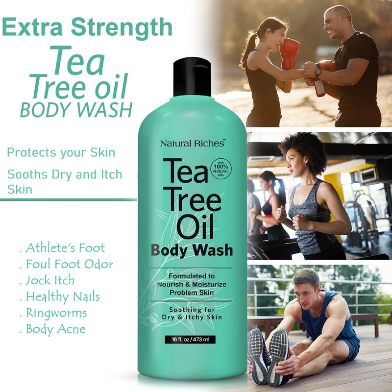 Introducing Natural Riches Tea Tree Body Wash, the ultimate solution for your skin's needs. Our premium formula is enriched with the finest ingredients, including tea tree oil, to provide you with a refreshing and invigorating bathing experience. Harnessing the power of nature, our Tea Tree Body Wash is designed to soothe skin irritations, combat body odor, and promote overall skin health. With a blend of tea tree, jojoba, coconut, rosemary, olive, oregano, peppermint, aloe, and eucalyptus oils, our body wash delivers a multitude of benefits for your skin. Say goodbye to athlete's foot, acne, cuts, ringworms, and other skin conditions with our clean body wash. Its potent properties help alleviate discomfort and irritation, leaving your skin feeling clean, refreshed, and revitalized. Our Tea Tree Body Wash is perfect for active teens, athletes, manual laborers, and anyone suffering from existing skin irritations. It cleanses, hydrates, and nourishes your hair, skin, and nails, ensuring you stay at the top of your game every day. Trust in the quality packaging of our BPA-free plastic bottle, designed with your health and well-being in mind. Embrace the confidence of using a safe, reliable product that delivers results you can trust. Experience freedom from itchiness with our invigorating blend of essential oils. Our Tea Tree Body Wash calms itching, banishes dryness, and eliminates unpleasant odors, giving you the confidence to embrace every moment. Indulge in the ultimate skin nourishment with our Tea Tree Body Wash. Immerse your skin in luxury with our vitamin-rich formula, leaving your skin feeling refreshed, rejuvenated, and irresistibly smooth/ Elevate your bathing routine with Natural Riches Tea Tree Body Wash. With its powerful blend of ingredients and refreshing scent, it's the perfect addition to your daily skincare regimen. Try it today and experience the difference!