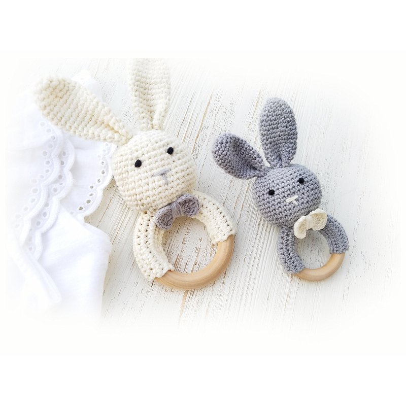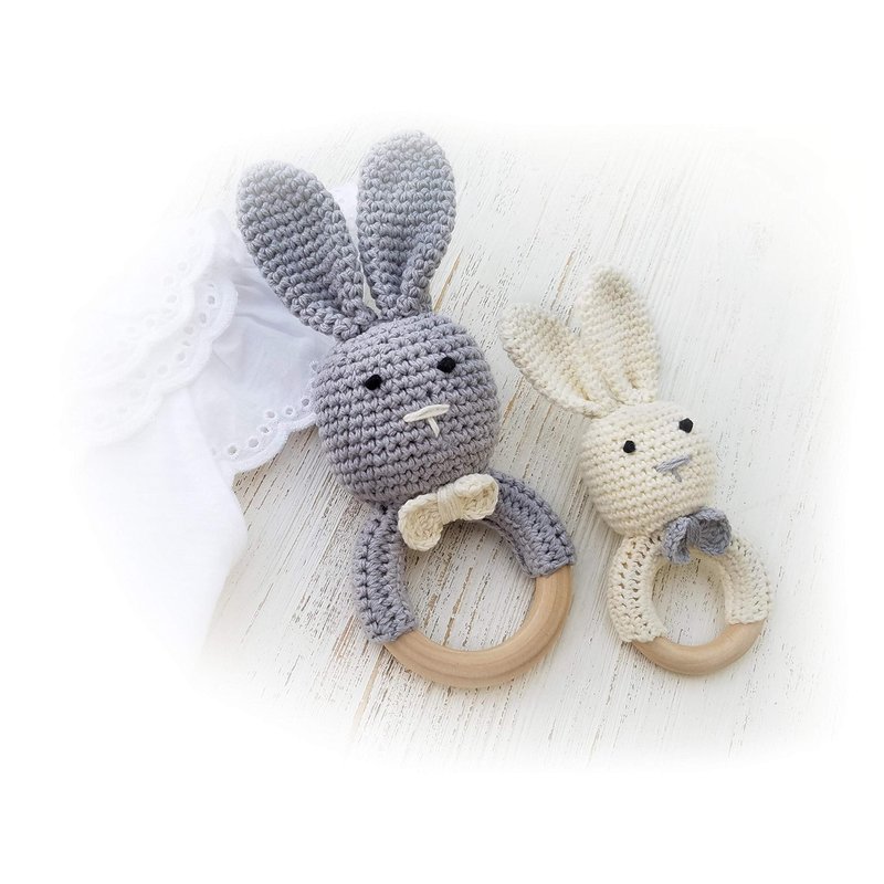 Natural Wooden Baby Toys Cotton Crochet Bunny Teething Ring Teether Rattle Set of 2 Newborn Unisex Baby (Grey Mama White Baby)