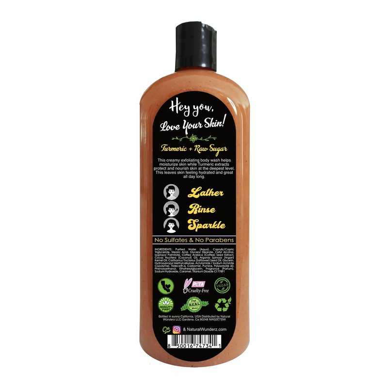 Introducing Natural Wunderz Turmeric + Raw Sugar Body Wash - Your Skin's New Best Friend! A true game-changer in skincare - Crafted with the utmost care, this formula combines the gentle yet effective exfoliation of raw sugar and the age-old healing benefits of Turmeric, leaving your skin beautifully rejuvenated and refreshed. Enriched with the nourishing power of Shea Butter, this sulfate-free and vegan-friendly blend delivers unparalleled hydration and deep moisturization, transforming your skin from dull to radiant. Free from harsh ingredients, our body wash is a perfect choice for those seeking a wholesome and ethical skincare experience. Unleash the beauty of your skin with a body wash that's not just another product, but a true wunder for your body care needs. Whether you're looking for a natural, organic, and non-toxic option or simply want a reliable and effective daily body wash, Natural Wunderz has got you covered. Remember, it's not just a body wash; it's a statement - a statement of self-love, wellness, and a commitment to the planet. Join the Natural Wunderz tribe today and experience the difference yourself! Say hello to healthy, happy skin with every wash.