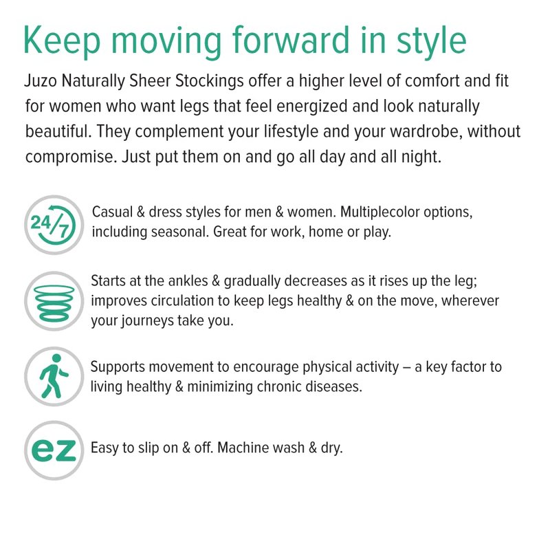 - MATERIALS: This compression stocking is made with a two-way stretch knit fabric for the perfect combination of comfort and compression. Designed to accentuate the natural beauty of your legs, Juzo’s Naturally Sheer stockings are comfortable to wear and are very fashionable.