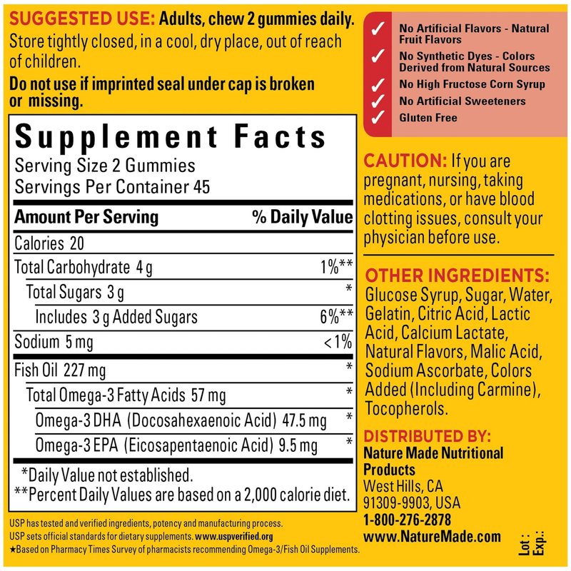 - Adults, chew two of these Nature Made Omega 3 Fish Oil gummies daily