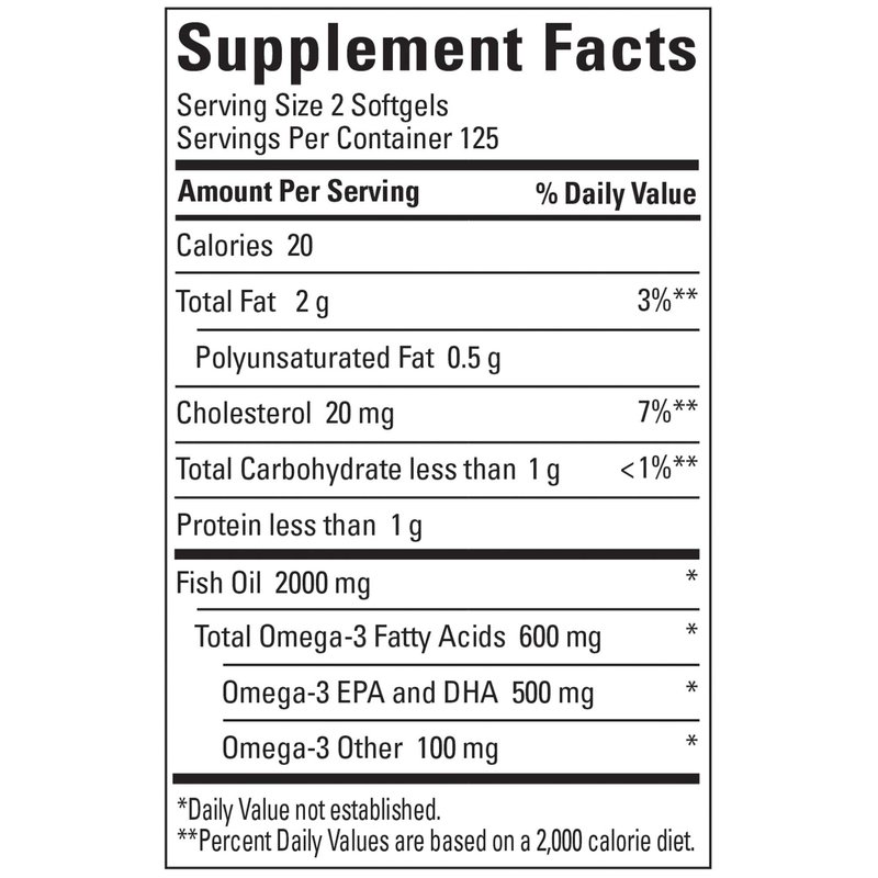- One serving of two fish oil softgels provides 600 mg Omega-3 fatty acids (500 mg EPA and DHA) to help support a healthy heart