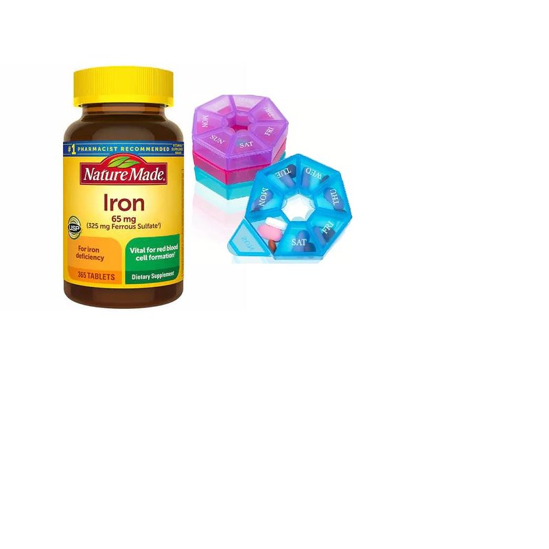 Nature Made Iron 65 mg (325 mg Ferrous Sulfate) Tablets, Dietary Supplement for Red Blood Cell Support, 365 Tablets, 365 Day Supply Bunde with Weekly Pill Organizer