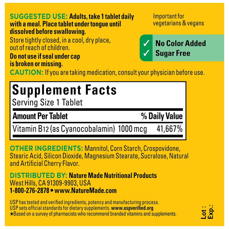 - Energy metabolism support supplement: contains one 50 count bottle of Nature Made Vitamin B12 1000 mcg Fast Dissolve Tablets for a 50-day supply(1)