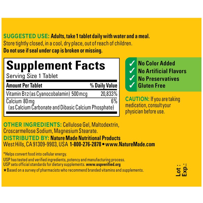 - Energy metabolism support supplement: contains one 200 count bottle of Nature Made Vitamin B12 500 mcg Tablets for a 200 day supply(1)