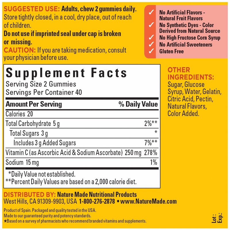 - Nature Made's Vitamin C gummy is made with pectin and has no artificial flavors, no synthetic dyes, no high fructose corn syrup, no artificial sweeteners, and is gluten free
