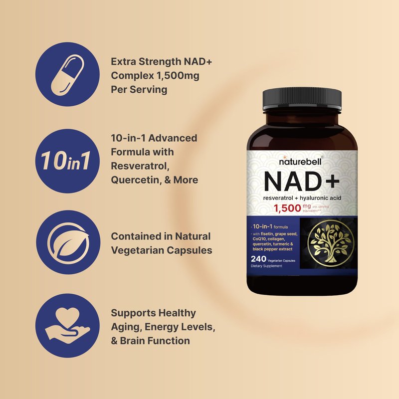 NatureBell NAD+ 1,500mg Per Serving, 240 Veggie Capsules | NMN Supplement Alternative | 10-in-1 Complex with Resveratrol Plus Hyaluronic Acid, Quercetin, Fisetin, Collagen, & More – Non-GMO