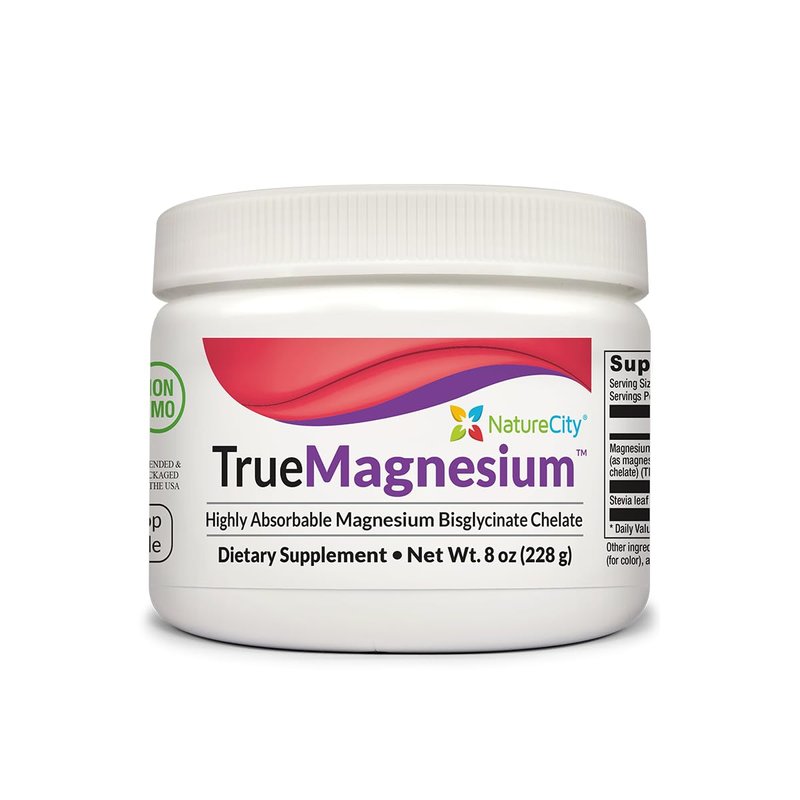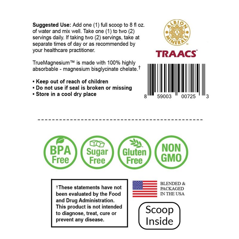 Magnesium is one of the most important minerals in the body, needed for over 325 physiological processes. Yet, it’s very possible you’re not consuming enough magnesium because according to the USDA, a majority of Americans fail to reach the Recommended Daily Allowance (RDA). For those seeking to increase magnesium intake, choosing a high quality nutritional supplement can help bridge the gap. The form of magnesium in your supplement is an important consideration. Many supplements contain magnesium forms, such as magnesium oxide, that aren't very efficient at delivering magnesium to the bloodstream. Others, such as magnesium citrate, function very well as a laxative, but aren’t efficient in the primary goal of increasing the amount of magnesium available for your body to use in blood, tissue, and bone. For TrueMagnesium, we use a form of magnesium that replicates how magnesium is naturally found in plants, which is known as a chelate (magnesium attached to a stabilizing carrier). In plants, chelation binds magnesium to a stabilizing carrier such as an amino acid. This makes them easy for us to digest and increases the bioavailability of the magnesium. The TRAACS magnesium bisglycinate chelate bonds magnesium to the amino acid glycine, and offers superior digestion and bioavailability. Each serving of TrueMagnesium provides 200mg of magnesium – and makes a delicious berry flavored drink when adding a scoop of TrueMagnesium to 8oz of water.