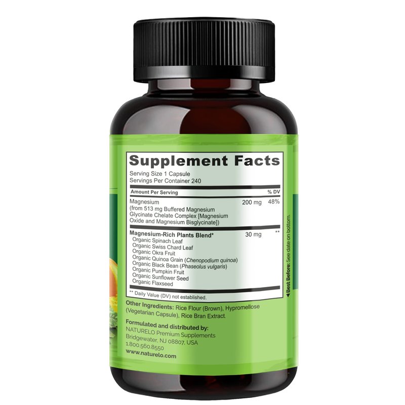 NATURELO Magnesium Glycinate Supplement - 200 mg Glycinate Chelate with Organic Vegetables to Support Sleep, Calm, Muscle Cramp & Stress Relief – Gluten Free, Non GMO - 240 Capsules