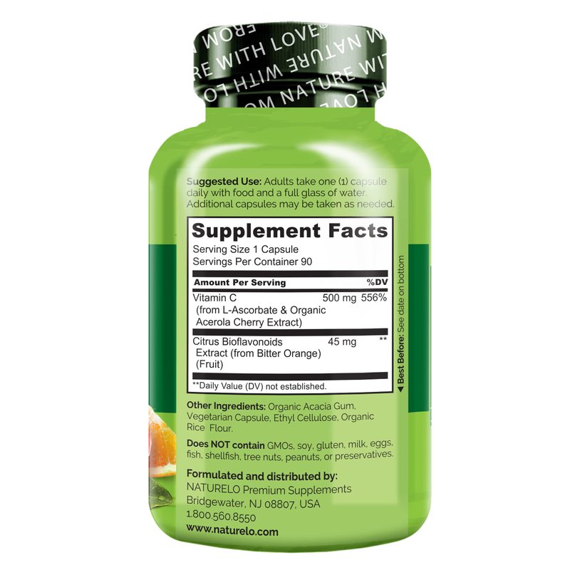 NATURELO Vitamin C with Organic Acerola Cherry Extract and Citrus Bioflavonoids - Vegan Supplement - Immune Support - 500 mg VIT C per Cap - Non-GMO - 90 Capsules