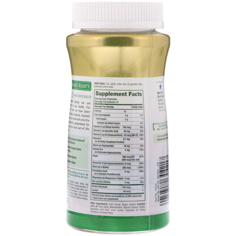 A delicious way to get the nutrients your body needs. Each serving of Nature's Bounty Adult Multivitamin Gummies provides 100% Daily Value or more of 4 key B Vitamins, Vitamin C and Vitamin D to keep you going strong while supporting your immune system and promoting bone health.
