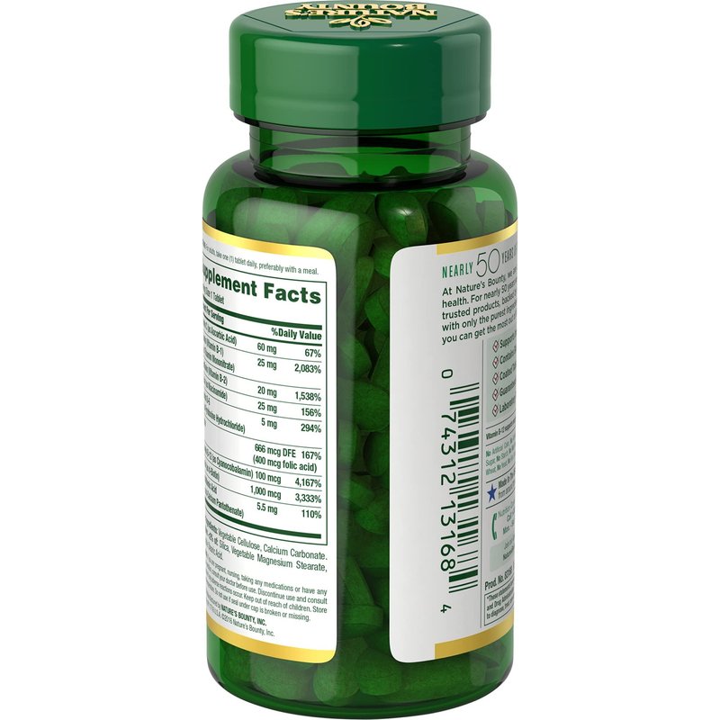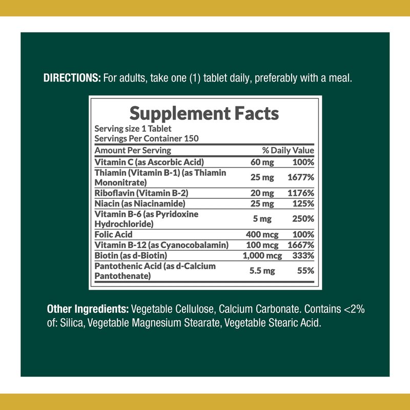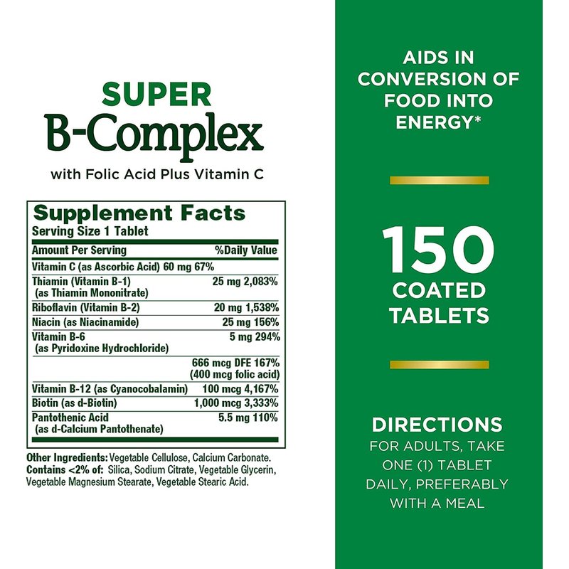 Nature's Bounty Super B Complex with Folic Acid Plus Vitamin C Tablets - 150 ct, Pack of 2 - The B Vitamin Complex is made up of several vitamins that work well together to support heart and nervous system health while providing nourishment for the occasional stress of daily living. Just one high-potency tablet a day includes a variety of B Vitamins, plus Vitamin C for heart, immune and antioxidant support. No Artificial Color, No Artificial Flavor, No Preservatives, No Sugar, No Starch, No Milk, No Lactose, No Soy, No Gluten, No Wheat, No Yeast, No Fish. Sodium Free. Suitable for Vegetarians. WARNING: If you are pregnant, nursing, taking any medications, or have any medical condition, consult your doctor before use. Discontinue use and consult your doctor if any adverse reactions occur. Keep out of reach of children. Store at room temperature. Do not use it if the seal under the cap is broken or missing. DIRECTIONS: For adults, take one (1) tablet daily, preferably with a meal.