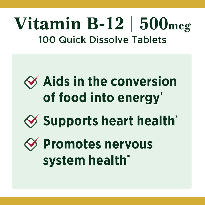 - FOR ENERGY 100-count Vitamin B-12 500mcg Tablets; Nature’s Bounty Quick Dissolve B-12 vitamins play an important role in energy metabolism in the body(1); They help the body convert food into the fuel which is used to produce energy in the body(1)