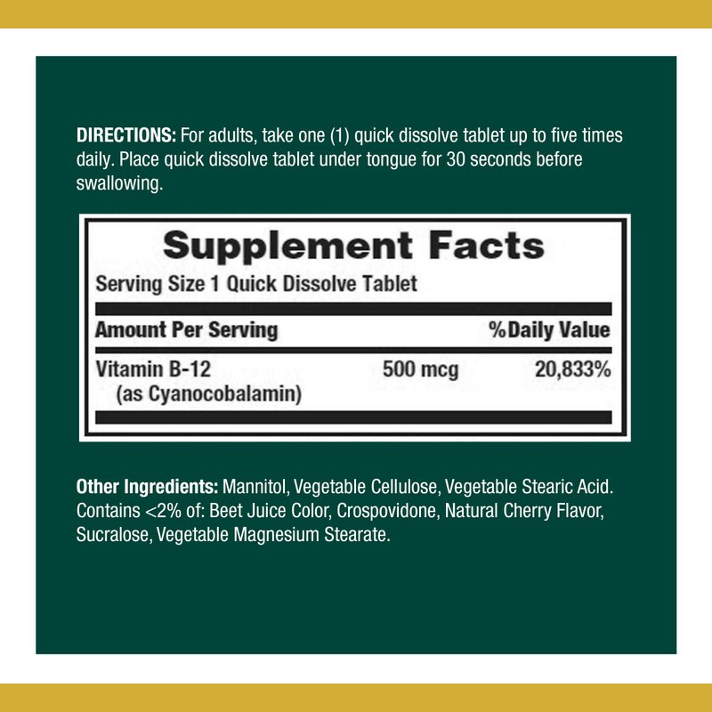 Nature's Bounty Vitamin B12, Supports Energy Metabolism and Nervous System Health, 500mcg, 100 Quick Dissolve Tablets