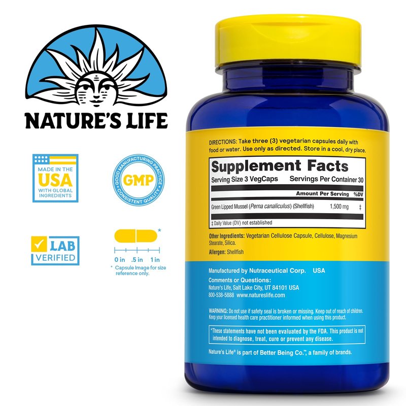 NATURE'S LIFE Green Lipped Mussel 1500 mg - New Zealand Green Lipped Mussel Supplement with Naturally Occurring Omega 3 Fatty Acids - 60-Day Guarantee, Lab Verified - 30 Servings, 90 Capsules