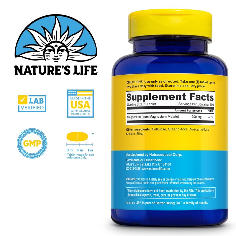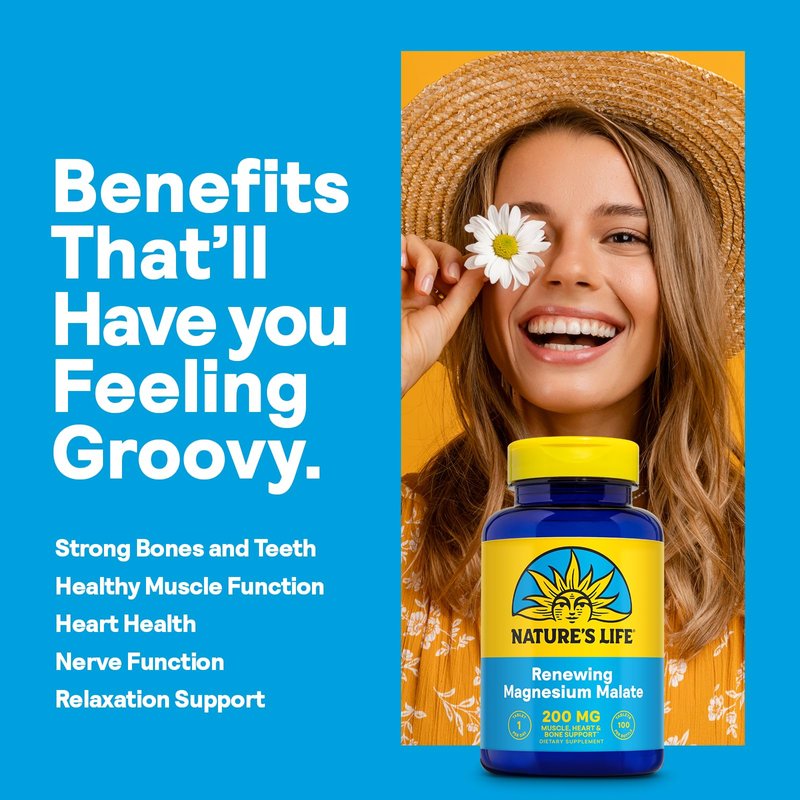 Nature's Life Renewing Magnesium Malate 200 mg - Once Daily Magnesium Supplement for Muscle and Nerve Function, Heart Health, Bone Support - Maximum Absorption, 60-Day Guarantee, 100 Serv, 100 Tablets
