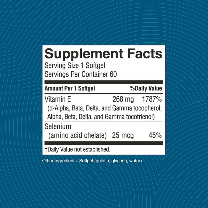 - Contains all eight molecules (4 tocopherols and 4 tocotrienols) in the Vitamin E family, plus selenium for maximum synergy.