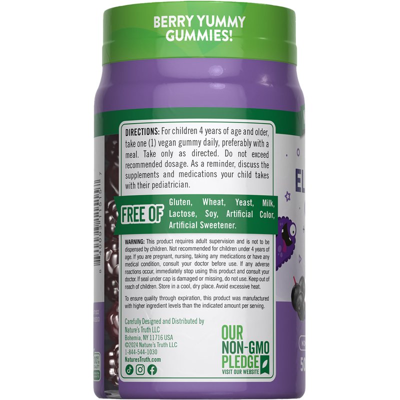Give your little ones the support they need with great tasting berry-flavored elderberry gummies they'll love! Nature's Truth Just 4 Kidz Elderberry Gummies are a delicious way for kids to get the important support of an Elderberry supplement, plus essential Vitamin C and Zinc. Sambucus Elderberry extract is naturally rich in antioxidants and flavonoids, and our elderberries are carefully harvested to preserve their quality. These vegan gummies are berry flavored and easy for kids to take. Just one berry burst flavored gummy a day provides the equivalent of 200 mg of Sambucus Elderberry, 50 mg of Vitamin C, and 3.75 mg of Zinc. Why choose capsules, tablets or powders when you can enjoy these delicious berry flavored gummies daily? At Nature's Truth, we know how important a clean wellness experience is for you and the ones you love. We use only the very best ingredients to create our Elderberry Gummies for kids. They are vegan friendly, Non-GMO, gluten free, wheat free, yeast free, milk free, lactose free, and soy free. They were created without any artificial colors, and artificial sweeteners, so you and your family can get the pure and honest nutrition you've come to expect from Nature's Truth.