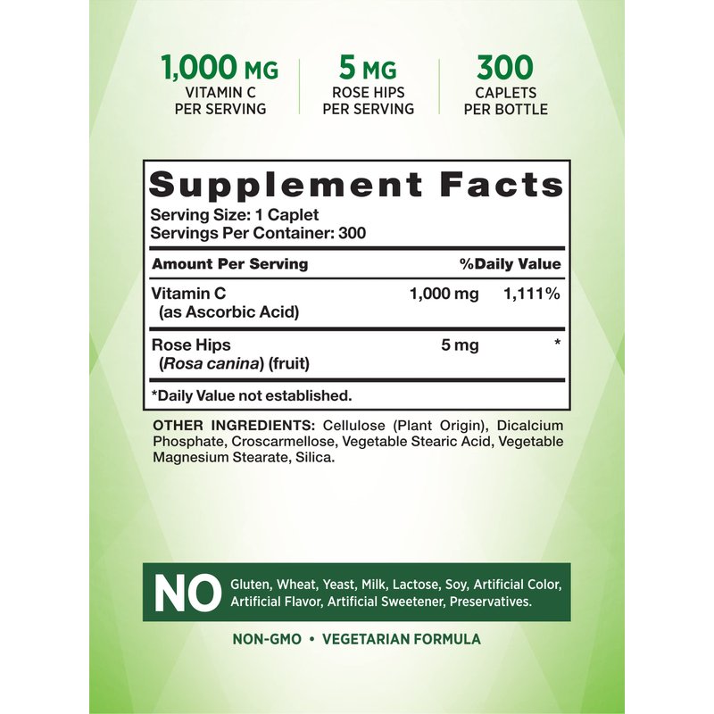 These convenient caplets are formulated to deliver 1,000 mg of Vitamin C plus 5 mg of Rose Hips, another known antioxidant, for additional support. Just one caplet per day is all you need to meet the recommended value of essential Vitamin C. With a quantity size of 300 caplets, this value size bottle will last more than nine months!