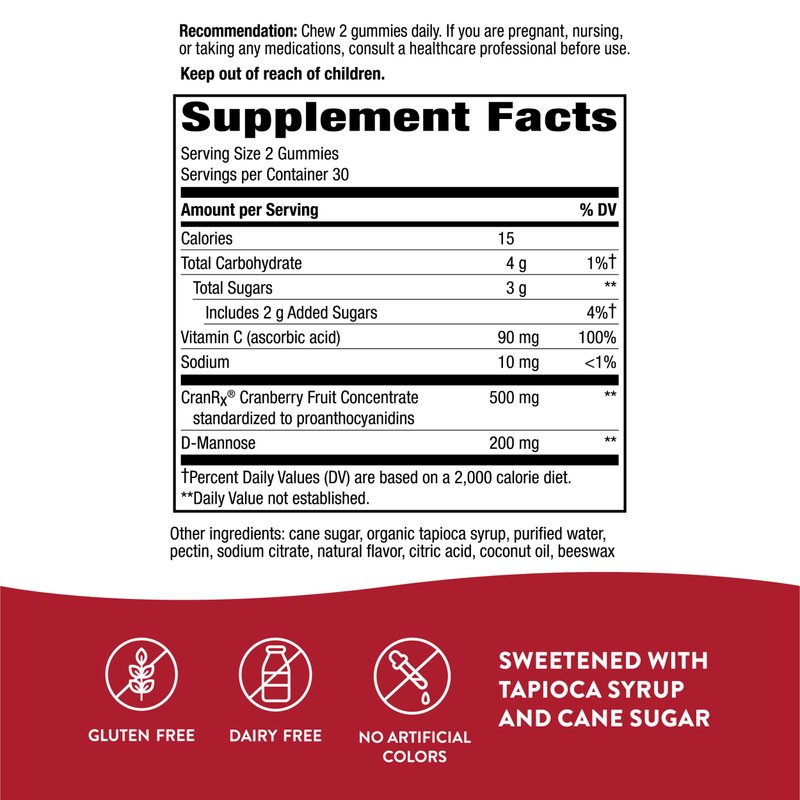 - Made with 100% whole cranberry (standardized to PACs), Vitamin C, and D-Mannose to support urinary health.*