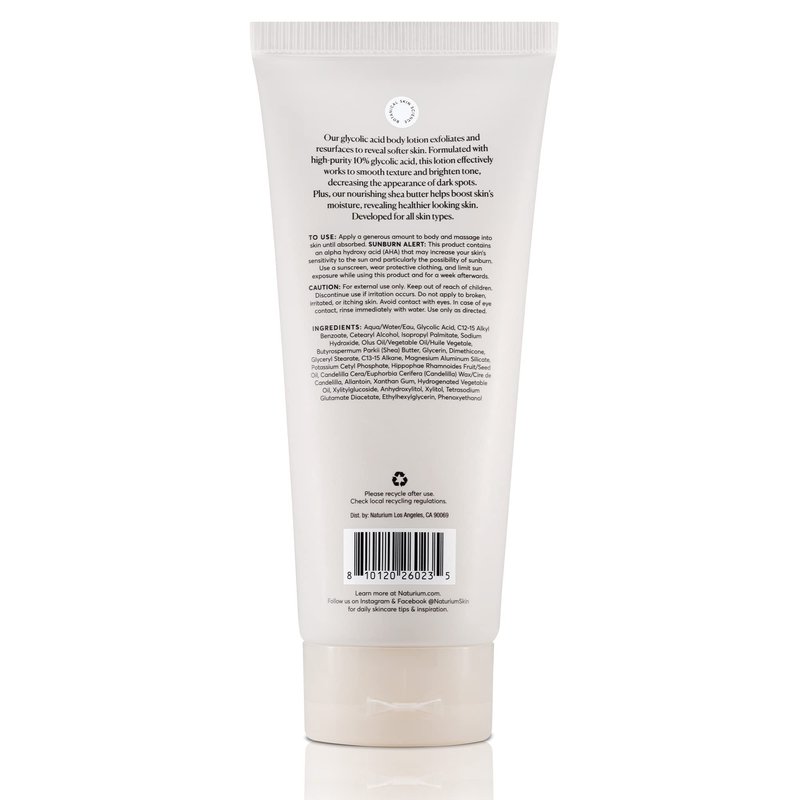 Our glycolic acid body lotion exfoliates and resurfaces to reveal softer skin. Formulated with high-purity 10% glycolic acid, this lotion effectively works to smooth texture and brighten tone, decreasing the appearance of dark spots. Plus, our nourishing shea butter helps boost skin's moisture, revealing healthier looking skin. What it does