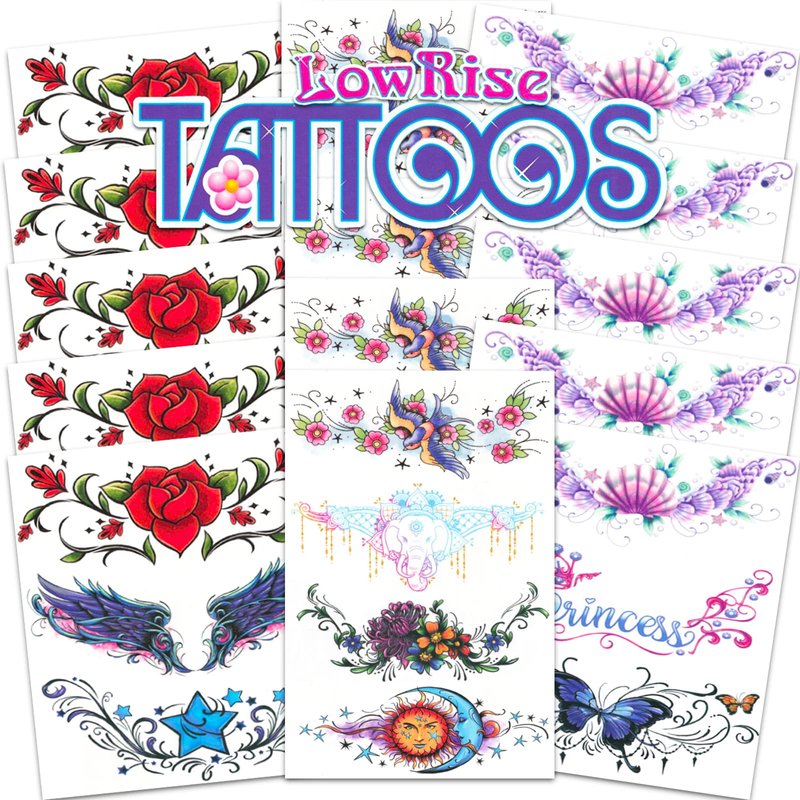 Navel Tattoos for Women ~ 50 Pcs Sexy Lower Back Temporary Tattoos Naughty | Bikini Tattoos Bachelorette Party Favors. Lower back tattoos are perfect for costumes, parties or to apply before going out. Easy to apply. Perfect as Halloween party supplies, party favors, temporary tattoos, costume accessories and more! This set of lower back and navel temporary tattoos has lovely designs including butterfly tattoos, rose tattoos and more! Low rise tattoos are high quality and MADE IN THE USA.